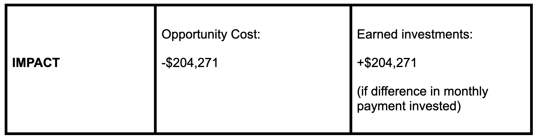 If you would notice from the table, if you chose a 30k vehicle, you end up having lesser net cost plus an additional $204k if you invested the difference on the monthly payment.